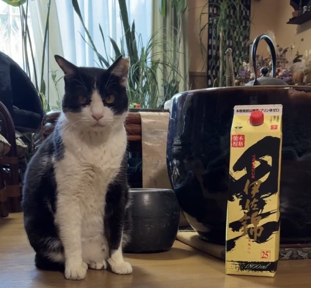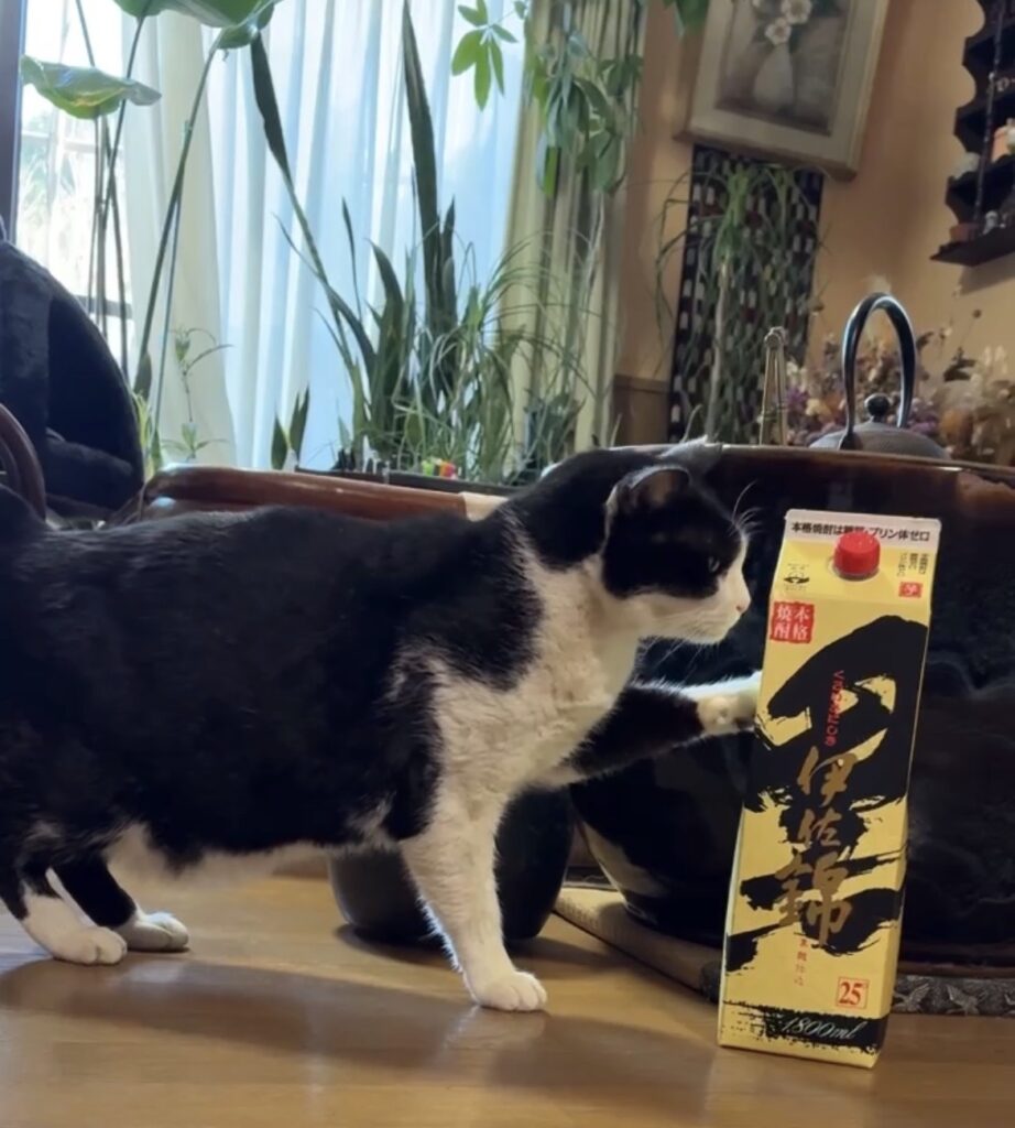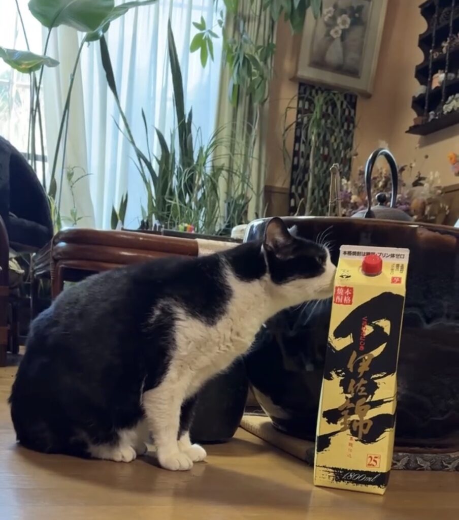 今回は、家にあった 黒伊佐錦 を目の前に置いてみたところ、「これは……飲めるやつ?」と言わんばかりに興味津々。